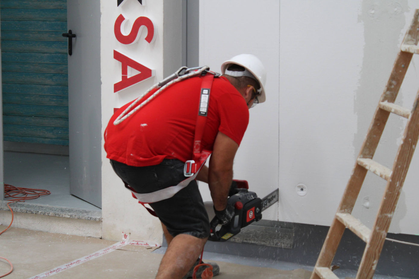 Una vez replanteando el hueco sobre el panel, procederemos a la apertura del mismo. Para ello podemos utilizar una sierra de mano o una motosierra. Recortamos el panel y retiramos la pieza sobrante. Más adelante repararemos, mediante tratamiento de juntas, los cantos expuestos tras el corte.